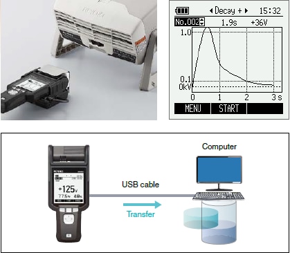 Inoltre, la serie SK dispone di una funzione di monitoraggio della carica che misura la velocità di eliminazione della carica e il bilanciamento degli ioni, indicando la capacità di eliminazione dell’ionizzatore. La memoria interna del sensore elettrostatico SK-H050 può contenere fino a 100 set di dati di misurazione. I dati memorizzati possono essere trasferiti a un computer tramite un cavo USB e salvati come dati CSV.