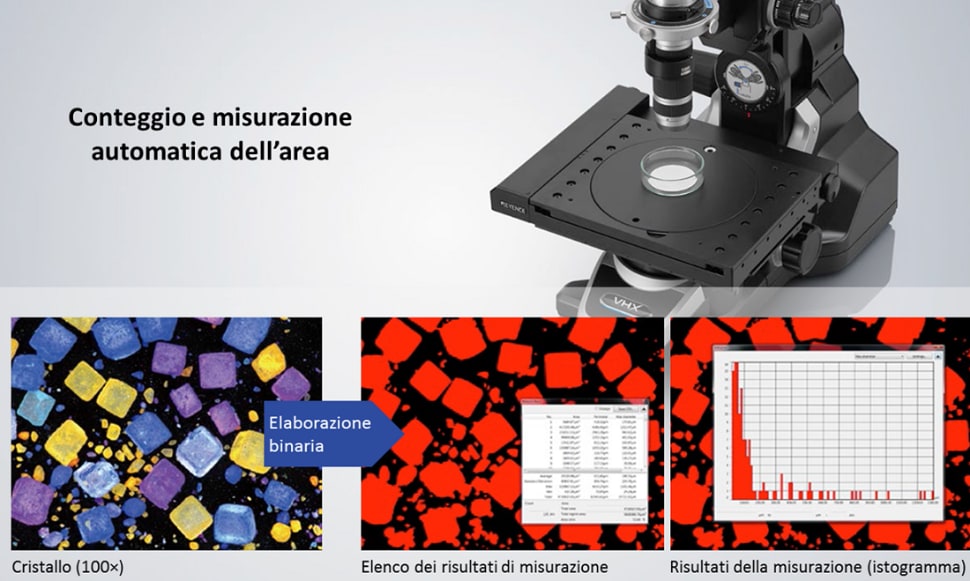 Il microscopio digitale KEYENCE è idoneo ad effettuare analisi delle particelle, controlli, ispezioni e analisi degli scarti. Con il microscopio digitale è possibile contare e misurare facilmente oggetti per determinare area, perimetro e altri parametri di misurazione in 2D e 3D.