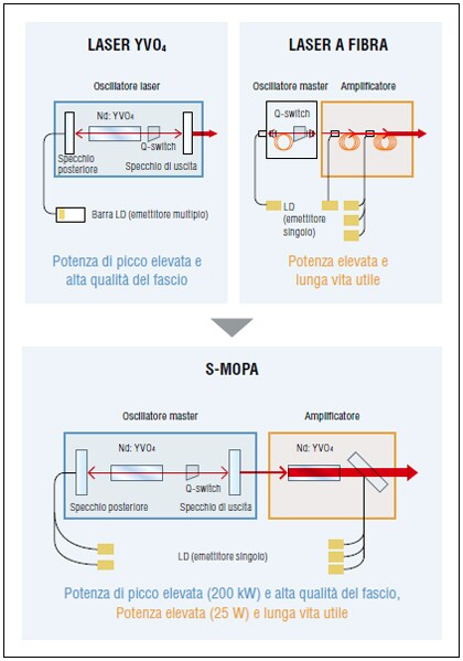 Viene usato come oscillatore principale quello basato sulla tecnologia YVO4 che produce un laser di elevata qualità, che viene quindi condotto in un amplificatore basato sulla tecnologia a fibra in modo da combinare il meglio di entrambe le tecnologie. L’utilizzo di un unico diodo laser emettitore come sorgente a forte dissipazione termica assicura una vita utile superiore se confrontato con i sistemi tradizionali.