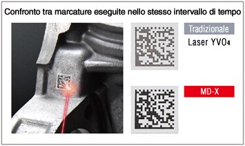 La Serie MD-X1500 ha una potenza di ben 25 W, il che equivale a circa 2 volte quella dei tradizionali laser YVO4. Questa potenza consente una marcatura e una lavorazione più rapide e contribuisce pertanto a migliorare la produttività. La Serie MD-X1500 può essere usata anche con oscillazione a onda continua (CW) o a impulsi, a seconda dell’applicazione. Tale flessibilità è utile ad esempio quando è necessario eseguire marcature rapide e di alta qualità come quella di codici 2D su superfici metalliche.