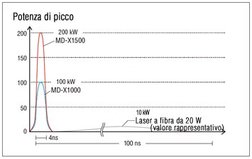 La Serie MD-X1500 raggiunge una potenza di picco di 200 kW, il che equivale a circa 2 volte quella di picco dei tradizionali laser YVO4. Anche se la Serie MD-X1500 genera un’alta potenza, l’ampiezza degli impulsi è di soli 4 ns, il che riduce al minimo i danni prodotti dal calore sull’oggetto target. Pertanto, il marcatore laser della Serie MD-X1500 risulta perfetto anche per applicazioni in cui è necessario eliminare il più possibile l’effetto del calore, come la marcatura colorata sulla resina.