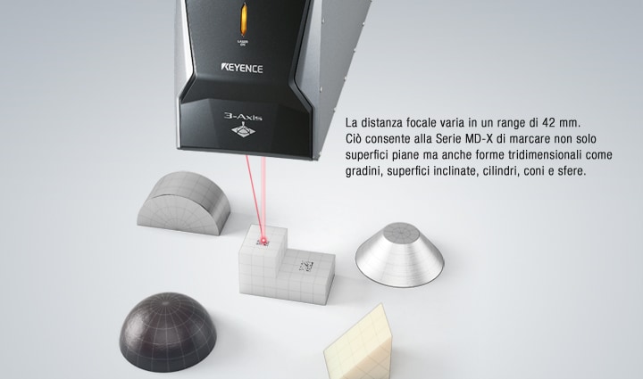 KEYENCE è stata la prima società al mondo a dotare i suoi marcatori laser della "Tecnologia a 3 assi" per il controllo tridimensionale. Lo scanner ad alta precisione sull’asse Z consente di controllare la distanza focale, rendendo possibili processi di marcatura laser innovativi. Adesso è inoltre possibile eseguire la messa a fuoco automatica utilizzando semplicemente un marcatore laser della Serie MD-X che offre un livello ancora superiore di comodità e facilità d’uso.