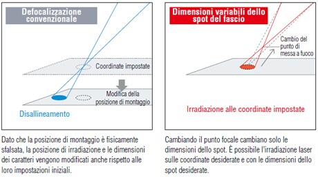 È utile poter spostare intenzionalmente la messa a fuoco quando l’oggetto target non deve essere inciso. La tecnica di defocalizzazione, che consiste nello spostare fisicamente la posizione di montaggio, porta a cambiamenti nelle coordinate e nelle dimensioni dei caratteri, il che a sua volta richiede regolazioni estremamente difficili. La funzione di variazione delle dimensioni dello spot del fascio permette di lasciare la posizione di montaggio così com’è e di regolare solo le dimensioni dello spot (la messa a fuoco). Risulta così possibile effettuare marcature e lavorazioni con le coordinate e le dimensioni impostate.