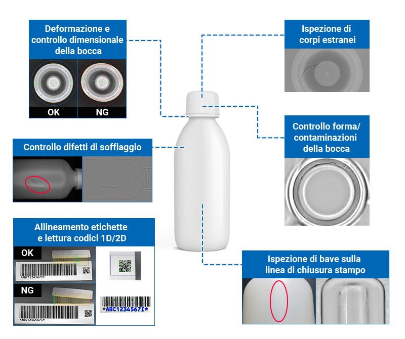 Le speciali bottiglie utilizzate per conservare sostanze chimiche possono richiedere un elevato livello di qualità . I sistemi di visione artificiale KEYENCE soddisfano le esigenze di ispezione automatica in linea e vengono utilizzati nelle linee di produzione di tutto il mondo.
