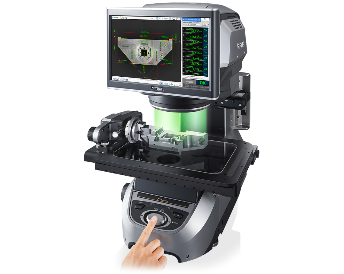 Grazie alla capacità di effettuare imaging ad alta definizione, il sistema di misurazione dimensionale tramite immagini Serie IM-8000 triplica le prestazioni di rilevamento rispetto ai sistemi tradizionali, senza sacrificare la semplicità di funzionamento: è sufficiente posizionare il target sul piatto e premere il pulsante. Con un sensore CMOS da 20 megapixel e un nuovo algoritmo che consente un rilevamento stabile dei bordi, è possibile misurare ad alta precisione fino a 300 punti in pochi secondi. Inoltre, la nuova unità rotante è in grado di ruotare i target di diverse forme e dimensioni mantenendoli orizzontali, per una misurazione multi-superficie stabile a 360° in un’unica operazione. Il funzionamento è semplice, basta premere il pulsante MEASURE. Garantisce risultati omogenei, indipendentemente dall’operatore, e riduce notevolmente le risorse investite nel lavoro di misurazione. Il funzionamento veloce, omogeneo e semplice di questo prodotto risolve vari problemi legati alle misurazioni.