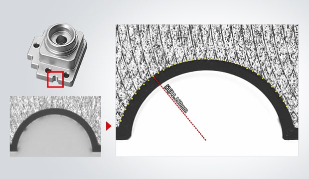 La sonda a contatto con pressione di misurazione bassa si muove liberamente in verticale, in orizzontale e in obliquo, consentendo di misurare i punti desiderati con un tocco delicato. Anche i pezzi con forme 3D possono essere misurati con precisione.