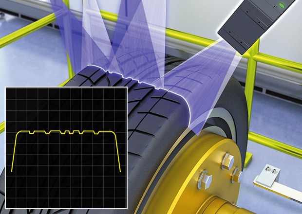 L'acquisizione e la misurazione di oggetti con dettagli o contorni complessi non è così semplice. In questi casi entrano in gioco i sensori di spostamento laser 2D. Anziché misurare un singolo punto come i sensori di spostamento laser 1D, i sensori di spostamento laser 2D misurano una linea di punti proiettata sulla superficie del target. La linea laser viene riflessa dalla superficie e rilevata dal sistema di ricezione integrato, che poi elabora la forma della linea riflessa nel profilo 2D dell'oggetto utilizzando algoritmi avanzati. Ciò consente al sensore di spostamento laser 2D di acquisire l'intero profilo 2D di un oggetto in una singola scansione, senza movimento. Ne è un esempio la misurazione del profilo delle scanalature del battistrada degli pneumatici.