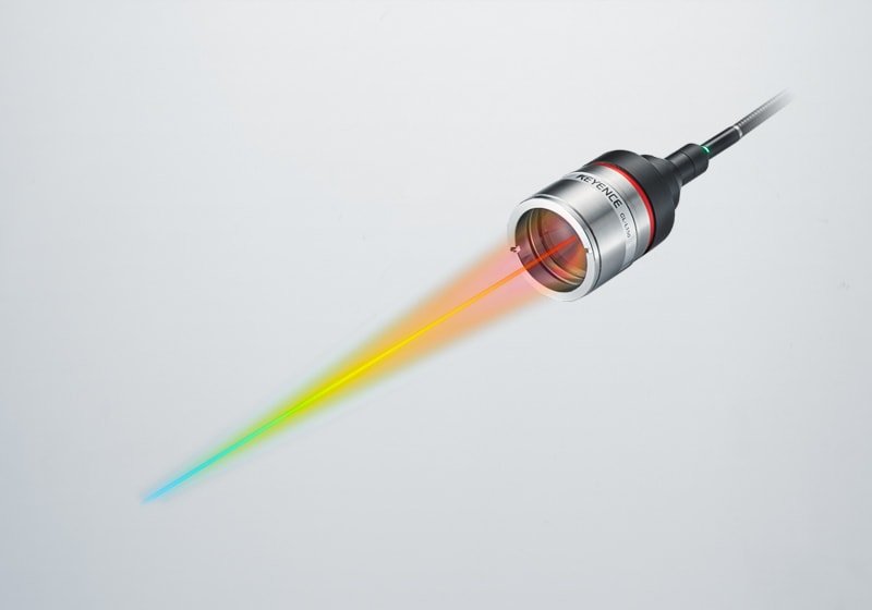 I sensori di spostamento confocale emettono e ricevono luce sullo stesso asse. Essi utilizzano una sorgente luminosa che emette più colori (lunghezze d’onda), ciascuno con una distanza focale unica. Il sensore misura la distanza dal pezzo rilevando quale colore è attualmente messo a fuoco sul pezzo stesso. I sensori della Serie CL-3000 di KEYENCE utilizzano una sorgente luminosa più intensa rispetto ai modelli convenzionali, producendo risultati di misurazione stabili su tutto il fondo scala, indipendentemente dalla riflettività della superficie.