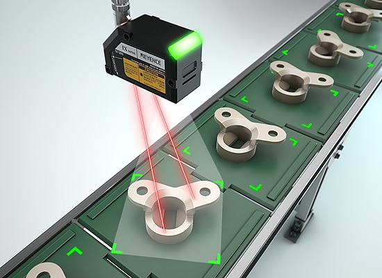 I sensori laser basati sulle immagini della Serie IX possono misurare l'altezza in qualsiasi punto dell'area inquadrata. Il riconoscimento dell'immagine della telecamera permette al laser di rilevare l'altezza del punto indicato anche quando i pezzi non sono perfettamente allineati sulla linea di produzione. L'altezza del punto in cui il laser colpisce il target varia se il target è inclinato o se il target stesso è diverso, ma la Serie IX può identificare differenze di altezza rispetto ad un riferimento. Ad esempio, in una linea di assemblaggio componenti, una singola unità della Serie IX può non solo controllare la presenza, ma anche eseguire controlli di posaggio e altre ispezioni basate sull'altezza. Grazie alla sua capacità di rilevare le differenze di altezza, la Serie IX è anche esente da falsi rilevamenti ed errori in presenza di riflessi da superfici lucide di parti metalliche o quando il punto di rilevamento ha lo stesso colore dello sfondo, offrendo una stabile differenziazione automatica in linea.
