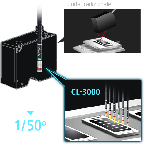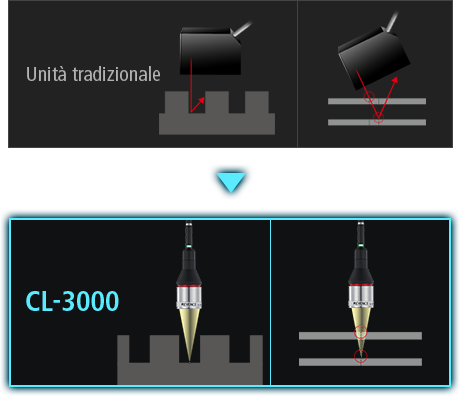 CL-3000 usa la tecnologia confocale multicolore per ottenere misurazioni di alta precisione su qualsiasi superficie o forma senza problemi di montaggio, con un intervallo di misurazione più ampio e migliori caratteristiche angolari.