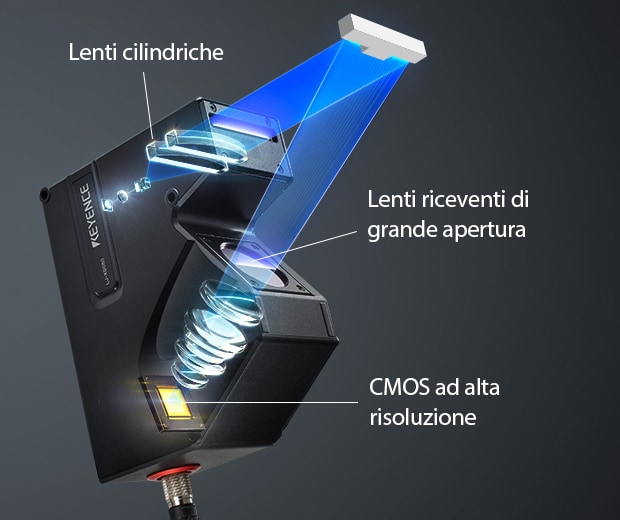 Il fascio di luce parallelo viene emesso servendosi di una lente cilindrica appositamente studiata per evitare la luce riflessa causata dalla diffusione sulla superficie dell'oggetto. Questo consente di ottenere riflessioni affidabili da qualsiasi forma e superficie.