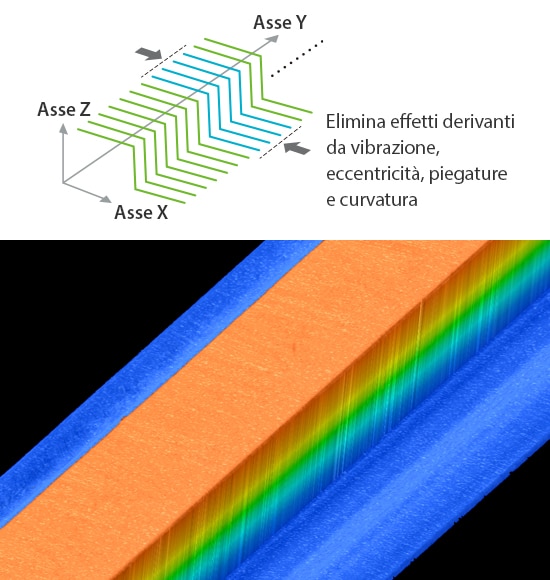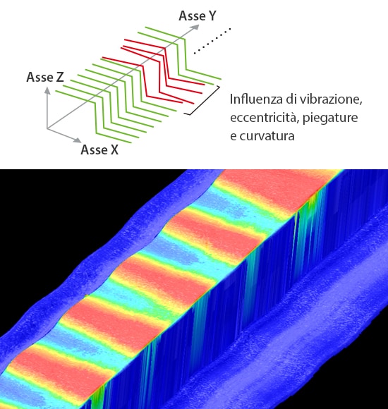 Quando si crea un'immagine 3D, le posizioni del profilo 2D sono regolate nelle direzioni X, Z e θ. Questo elimina gli effetti derivanti da vibrazione ed eccentricità, nonché piegature e curvatura nell'oggetto, creando un'immagine adatta ai controlli.
