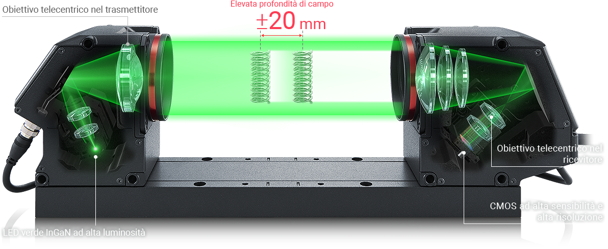 Il doppio sistema ottico telecentrico, con obiettivi telecentrici nel trasmettitore e nel ricevitore, garantisce bordi nitidi, senza sacrificare la precisione, anche per i target non correttamente allineati.
