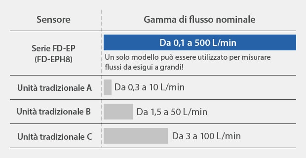 I sensori di flusso aria tradizionali hanno una gamma di flusso nominale diversa a seconda del modello, anche per lo stesso diametro di tubo, il che rende molto difficile trovare il modello appropriato per nuove applicazioni. La Serie FD-EP è in grado di gestire flussi da esigui a grandi, senza doversi preoccupare del flusso nominale. Scegliere un prodotto è facile come scegliere il diametro di un tubo.