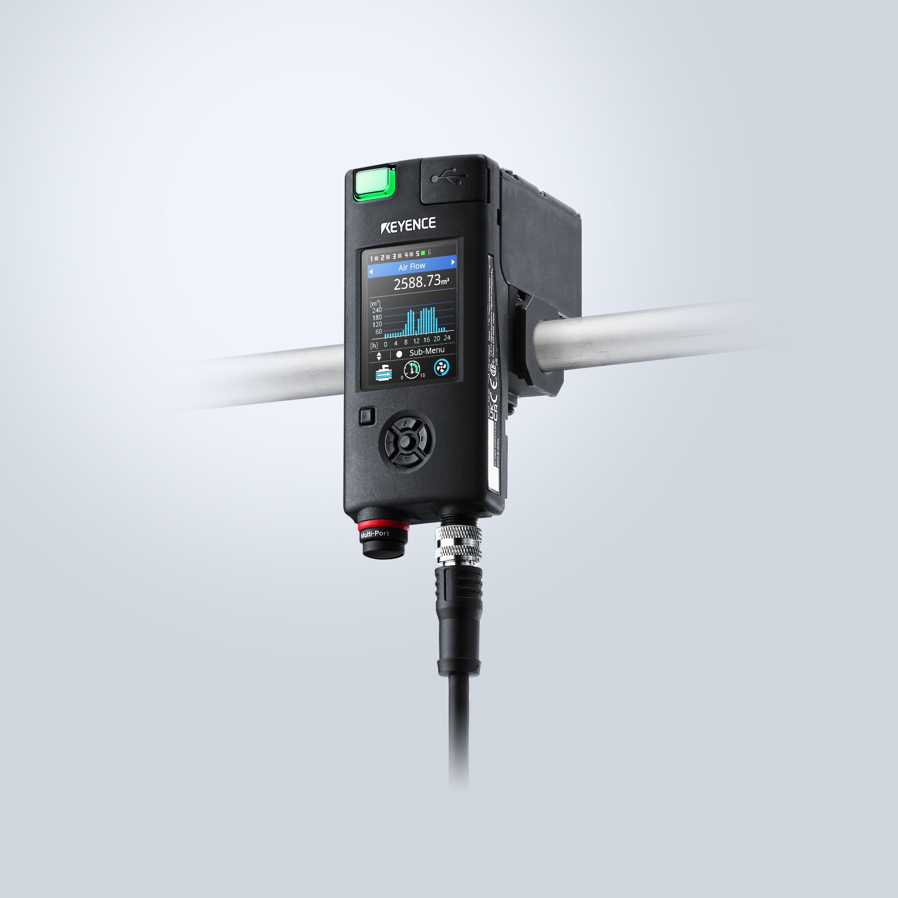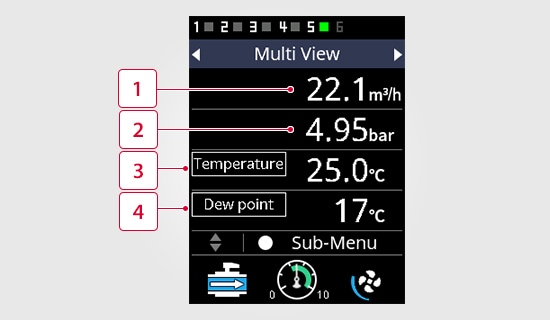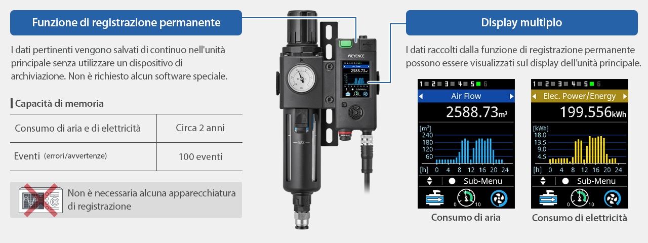 Permette di visualizzare facilmente il consumo energetico delle apparecchiature (consumo di aria e di elettricità*), fattore importante per le misure di risparmio energetico. L'unità dispone inoltre di una "funzione di registrazione permanente" che registra automaticamente i dati sull'unità principale. I dati raccolti possono essere visualizzati su un display multiplo in modo chiaro.