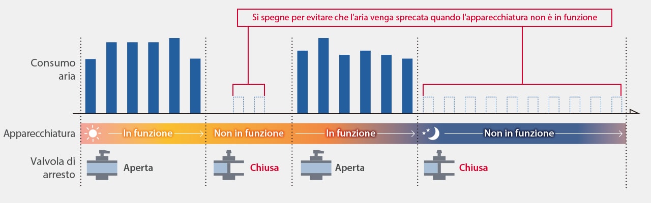 L'apparecchiatura che consuma aria può generare sprechi immensi a causa di perdite, anche quando non è in uso. La Serie MP-F è dotata di una valvola di arresto per chiudere l'aria quando l'apparecchiatura non è in funzione. Ciò può ridurre il consumo di aria non necessario, facendo risparmiare energia sulla base di ogni singola apparecchiatura.