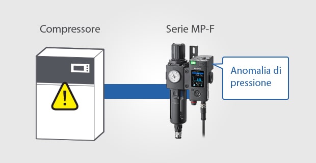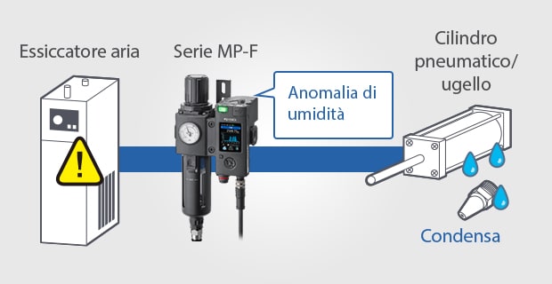 La perdita di pressione e la condensa sono esempi di problemi che si verificano con l'aria. La Serie MP-F monitora le condizioni dell'aria con sensori di pressione, temperatura e umidità per rilevare i problemi causati da perdita di pressione e condensa prima che si verifichino e avvisare gli operatori di eventuali anomalie.
