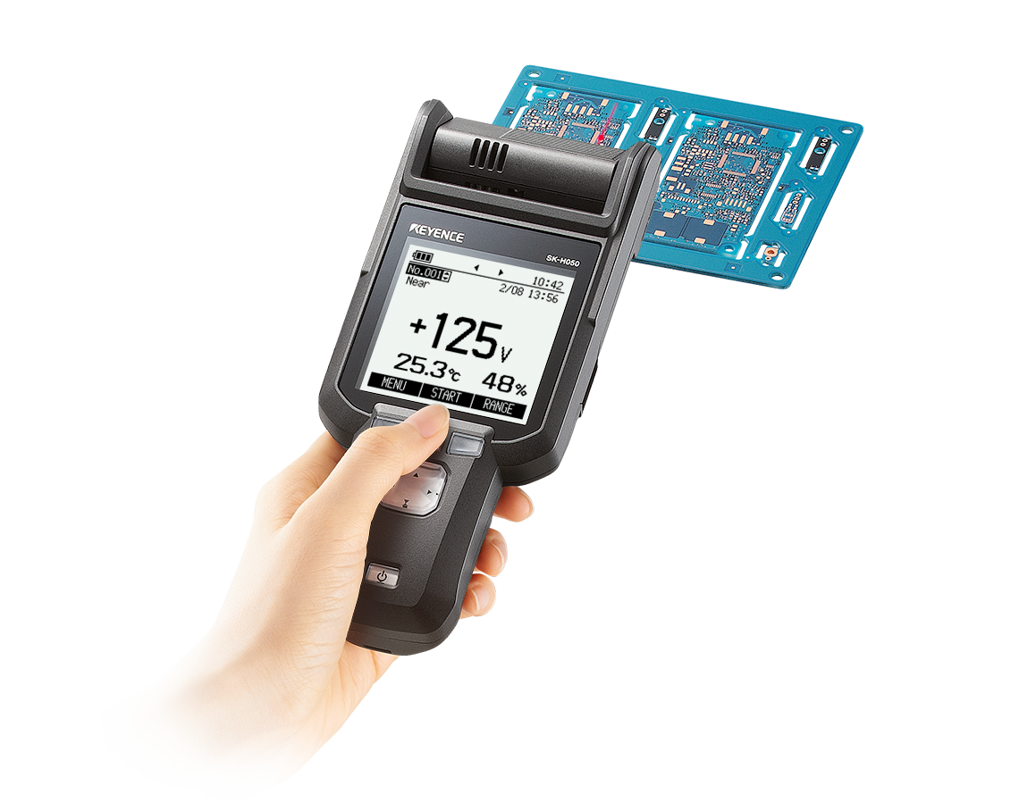 Il sensore elettrostatico portatile di KEYENCE è ampiamente utilizzato come modello base per quantificare le cariche elettriche di elettricità statica. Può anche misurare la temperatura e l'umidità, consentendo di avere un quadro completo della relazione tra condizioni ambientali ed elettricità statica. Inoltre, può valutare le prestazioni di eliminazione dell'elettricità statica degli ionizzatori, come la velocità e il bilanciamento degli ioni. In questo modo, il sensore favorisce il funzionamento e la manutenzione efficaci degli ionizzatori, contribuendo anche a prevenire problemi di elettricità statica. Questo sensore portatile consente misurazioni flessibili in qualsiasi posizione, offrendo il grande vantaggio di supportare esigenze diverse nelle applicazioni in loco.