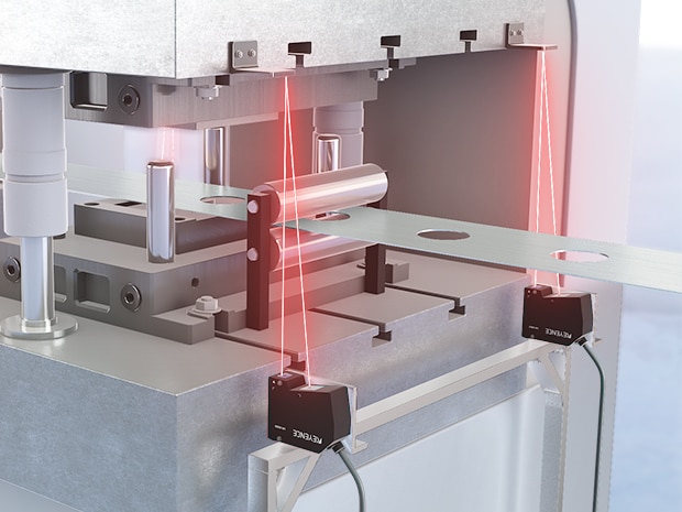 A seconda del comportamento della corsa della pressa, la trafilatura potrebbe non essere effettuata correttamente e determinare la formazione di crepe. L’utilizzo di un sensore di spostamento laser a lungo raggio rende possibile abbreviare i tempi richiesti per l’impostazione delle condizioni.