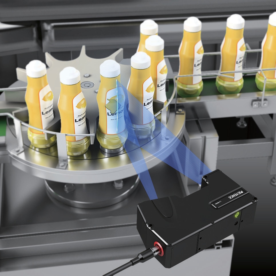 È difficile per le telecamere tradizionali identificare strappi nel film di cellofan trasparente utilizzato sulle superfici delle bottiglie, rendendo impossibile eseguire un'ispezione stabile. Le ispezioni laser delle superfici con la Serie LJ-X acquisiscono con precisione i cambiamenti delle forme superficiali causati da strappi nel film.