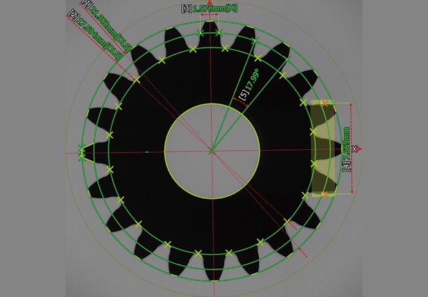 Il proiettore di profili rende possibile misurare facilmente cerchio di picco, angolo di passo dei denti, coassialità, diametro del foro e fattori simili utilizzando linee virtuali.