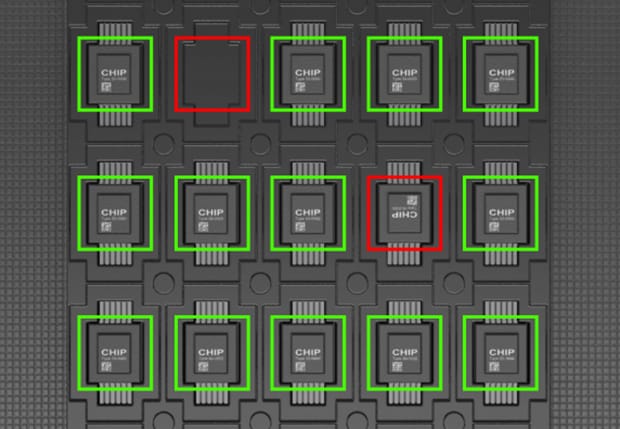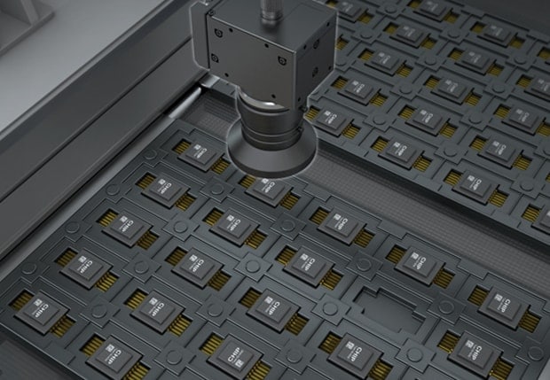 I sistemi di visione artificiale permettono di leggere più caratteri incisi sulla superficie dei chip di circuiti integrati. Con una sola telecamera a scansione lineare si possono riconoscere contemporaneamente diversi tipi di carattere come codici prodotto e codici 2D.