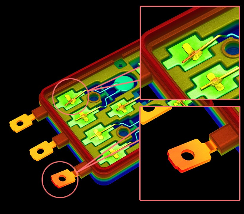 Con l'immagine 2D tradizionale i giunti saldati fuori asse e i capicorda piegati sono difficili da rilevare poiché i soli valori della scala dei grigi non sono sufficienti ad assicurare l'affidabilità delle ispezioni. Le immagini 3D accrescono la stabilità delle ispezioni grazie ai dati di altezza, quindi è possibile verificare il fuori asse, il distacco del filo e i difetti di saldatura senza preoccuparsi della variazione di colore del pezzo.