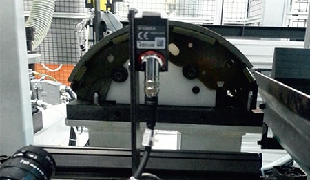 La prima parte della macchina comprende due grosse mole e un sistema robotizzato che carica le ganasce da un alimentatore. Infatti, le ganasce vengono ricevute impilate a gruppi di 30-40 unità su un sistema di trasporto, per offrire un buffer di lavoro all’operatore. Il robot carica quindi la ganascia sulla prima tavola rotante che la porta sotto la prima mola, dove viene eseguita una sgrossatura su tutta la sua circonferenza. Successivamente la tavola ruota e porta la ganascia sotto la seconda mola, che esegue una finitura superficiale in modo da ottenere il diametro richiesto. A questo punto il robot preleva la ganascia e la sposta sulla seconda tavola rotante per potere eseguire una serie di controlli. In particolare, le prime due postazioni, di controllo metrico, misurano tramite tastatori alcune quote meccaniche del pezzo come raggio assoluto, raggio polare, parallelismo e così via. Nelle due postazioni successive sono state invece installati sistemi di visione KEYENCE che verificano una serie di aratteristiche di qualità del prodotto in base alle esigenze del cliente: la geometria di tutti i fori e delle asole, l’altezza e la larghezza delle alette della ganascia, la marcatura sul lining con distinzione del colore blu/bianco/rosso (tre tipi di ganasce), il punto di attacco fascia e il punto di attacco lining, la presenza e l’area tempra, fino alla presenza della luce fascia/costa. In particolare, la presenza di luce fra due lamiere saldate è motivo di scarto del pezzo. “I dispositivi KEYENCE sono stati programmati in modo che vengano eseguiti tutti i controlli specifici al pezzo che viene disposto sulla tavola dal robot, cambiando la combinazione di misure e controlli quando si presenta un pezzo di tipo diverso”, spiega l’ingegner Fenoglio. “Dopo questi controlli, la macchina scarta automaticamente i pezzi fuori tolleranza”.