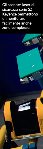 Global Automation ha protetto i quattro lati dell’impianto utilizzando gli scanner laser di sicurezza SZ-01S KEYENCE (uno per ogni lato), preferendoli alle tradizionali cortine luminose.