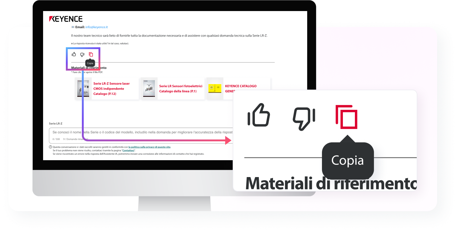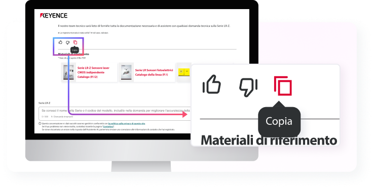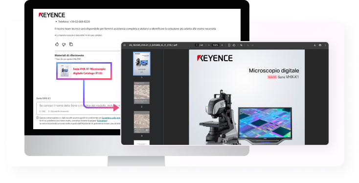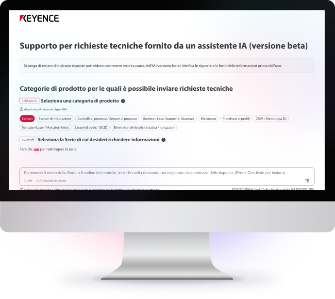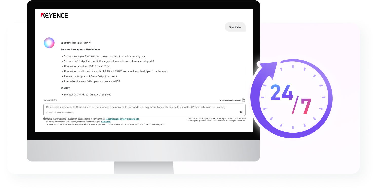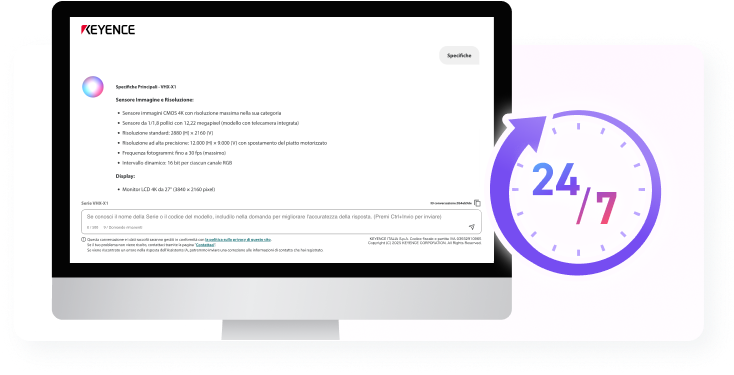 KEYENCE ha lanciato un assistente di IA generativa per gestire le richieste tecniche sui nostri prodotti. L'assistente risponderà tempestivamente a problemi e domande che potreste incontrare durante l'utilizzo dei nostri prodotti.