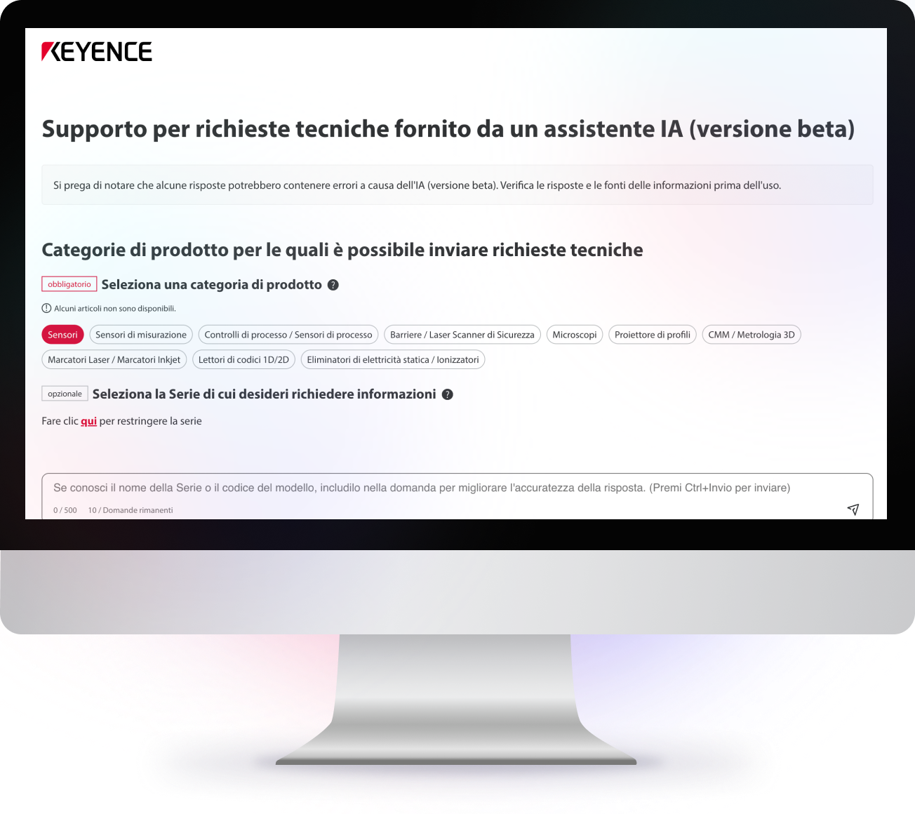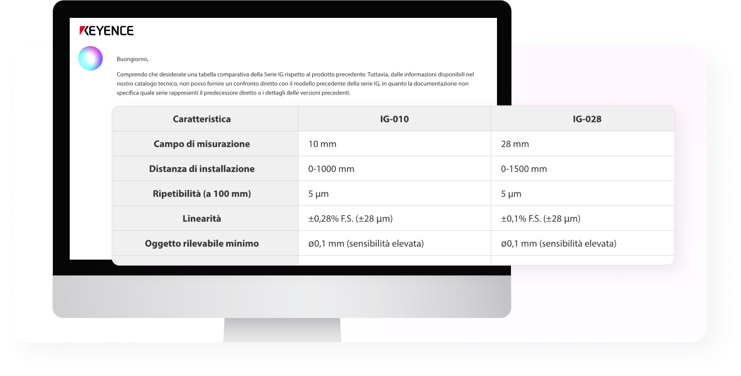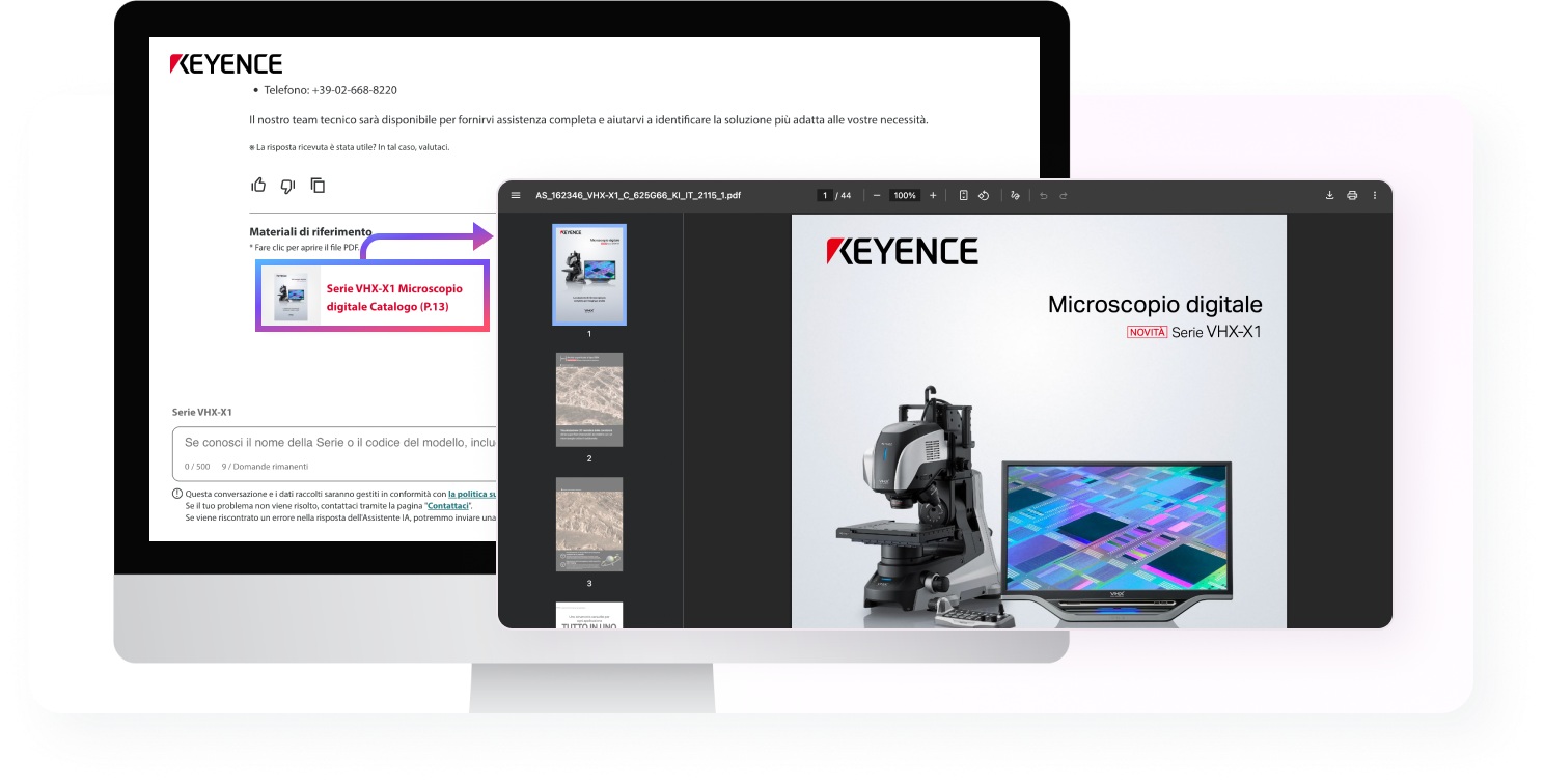KEYENCE ha lanciato un assistente di IA generativa per gestire le richieste tecniche sui nostri prodotti. L'assistente risponderà tempestivamente a problemi e domande che potreste incontrare durante l'utilizzo dei nostri prodotti.