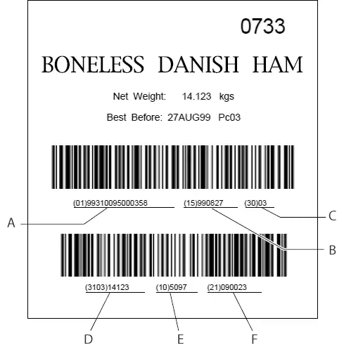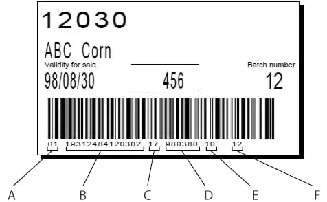 Nell’esempio sopra, a seguito dell’identificativo dell’applicazione “01”, è assegnato un codice di 14 cifre per identificare il contenitore di consegna (unità pacchetto minima per le scatole di cartone ondulato). A seguito dell’identificativo dell’applicazione “15”, sono forniti i dati che rappresentano la validità della qualità (validità di consumo o validità del farmaco) per mostrare 27 agosto ‘95. A seguito dell’ultimo identificativo dell’applicazione “30”, sono forniti i dati che rappresentano la quantità di consegna per mostrare 3 pezzi.