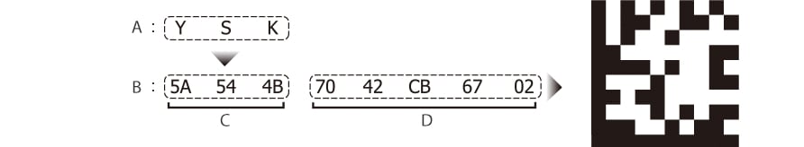 Per la conversione di “YSK” in un codice DataMatrix: gli YSK sono codici codificati e di correzione degli errori calcolati come di seguito e disposti a quadrato.