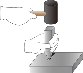 Il timbro viene tenuto in mano e battuto da sopra con un martello. I caratteri che si vengono a creare sono profondi e pieni, pertanto questo tipo di incisione può essere usato per creare un testo resistente al deterioramento derivante da graffi profondi e sfregamento.