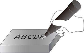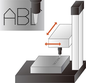 Il perno, chiamato perno di marcatura, è azionato dalla pressione dell'aria o elettricamente per incidere la superficie del target marcandolo con gruppi di punti. Questo metodo è noto anche come incisione per microimpatto. È ottimo per incidere materiali duri come superfici metalliche irregolari e resine composite. L'incisione è possibile a prescindere dalle condizioni della superficie (bagnata, polverosa, ecc.) del target.