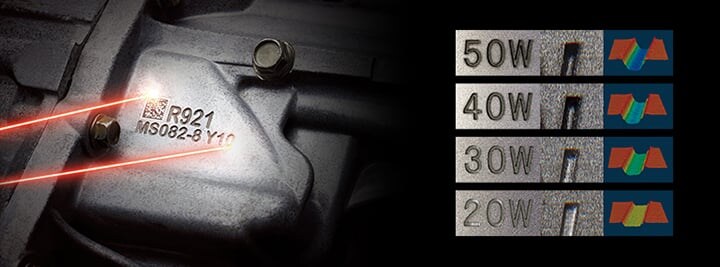 Una potenza maggiore del laser consente tempi di marcatura più brevi e incisioni più profonde. I risultati variano anche in base al materiale da marcare, quindi la potenza ottimale cambia da un'applicazione all'altra.