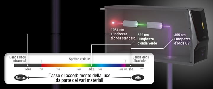 Man mano che la lunghezza d'onda del laser si accorcia, il contrasto migliora e si riducono i danni al prodotto. I risultati variano anche in base al materiale da marcare, quindi la lunghezza d'onda ottimale cambia da un'applicazione all'altra.