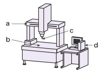 Una macchina di misurazione a coordinate del tipo a contatto rileva le coordinate tridimensionali (X-Y-Z) quando l'operatore specifica il punto o la linea di misurazione del target con lo stilo sferico che si trova sulla punta della sonda. Poiché gli elementi (linee rette, piani, cerchi, sfere, ecc.) vengono calcolati da un set di coordinate rilevate, una macchina di misurazione a coordinate è in grado di misurare precisamente angoli, rapporti di posizionamento tra gli elementi, il profilo e le deviazioni geometriche, in aggiunta alle lunghezze di oggetti stereoscopici complessi.