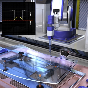 Utilizzando i profilometri laser è possibile monitorare larghezza, altezza e volume dei cordoni adesivi subito dopo il loro deposito, per garantire gli standard di qualità richiesti e ridurre al minimo la rilavorazione. È possibile eseguire questa ispezione su cordoni di qualsiasi colore o materiale, compreso l’uretano nero applicato su un parabrezza di vetro.