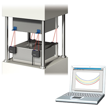 Con i sensori di spostamento laser a lungo raggio è possibile monitorare con precisione elevata la corsa delle presse. Grazie ai sensori che misurano fino a 1 m e alla velocità di campionamento elevata, la Serie LK-G3000 rende possibile la misurazione ad altissima precisione della corsa delle presse, senza rischiare di danneggiare la strumentazione.