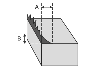 La dimensione di una bava è espressa come spessore della sua base (A in questa figura) o come altezza (B in questa figura).