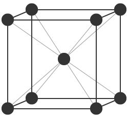 Il ferro a temperatura ambiente prende la forma di una griglia cubica a corpo centrato, in cui gli atomi si trovano a ciascun vertice e al centro del cubo.