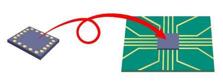 Il metodo in cui i chip di circuiti integrati vengono fissati direttamente a una PCB è chiamato FC-BGA (Flip Chip-BGA). Le protuberanze vengono realizzate sugli elettrodi di un chip IC e poi collegate agli elettrodi di un PCB. In questo modo si risparmia spazio rispetto al wire bonding.