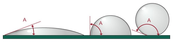 - Si può dire che la bagnabilità è maggiore quando l'angolo di contatto θ (A nella figura) è più vicino a zero gradi. Per la saldatura, una maggiore bagnabilità si traduce in una maggiore forza di adesione tra la scheda e i componenti montati. Un angolo di contatto θ estremamente elevato (bassa bagnabilità) può causare difetti di montaggio e, se la crema di saldatura si indurisce in modo sferico, generare sfere di saldatura che possono causare cortocircuiti. Per evitare questi problemi, è importante verificare la bagnabilità della crema di saldatura sulle basi prima dell'uso nei processi di montaggio automatizzati, in particolare nel processo di rifusione.