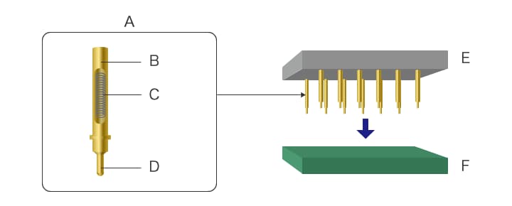 Il numero richiesto di sonde di contatto viene pressato in una maschera di resina progettata per l'obiettivo di ispezione e le punte dei pistoncini vengono portate a contatto con questo obiettivo. Questo strumento è altamente manutenibile perché può essere utilizzato ripetutamente semplicemente sostituendo le sonde usurate nella maschera.
