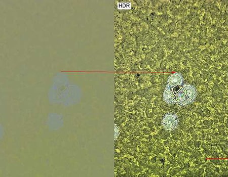 Il microscopio digitale 4K della Serie VHX ha una profondità di campo 20 volte superiore a quella dei microscopi tradizionali. Inoltre, la funzione di imaging ad alta gamma dinamica (HDR) acquisisce più immagini a velocità diverse dell'otturatore per ottenere un'immagine con elevata gradazione di colore e contrasto. È possibile analizzare difetti microscopici anche su superfici altamente riflettenti con poco contrasto.