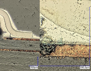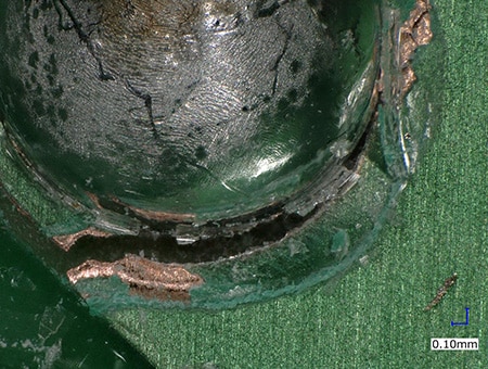 - Le cricche di saldatura si verificano o progrediscono a causa di fattori quali la fatica, il passare del tempo e l'applicazione di sollecitazioni dopo la formazione dei legami di saldatura. Se le fessure che sono microscopiche durante le fasi iniziali del confezionamento crescono, la resistenza del legame aumenterà. Esistono persino casi in cui le rotture delle saldature provocano un riscaldamento Joule. Le crepe possono anche separare completamente il legame, causando un guasto del componente. In particolare, si dice che le cricche nelle saldature senza piombo progrediscano rapidamente una volta formatesi. Dal momento che le cricche di saldatura cresciute possono generare calore e causare incendi, devono essere ispezionate con attenzione.