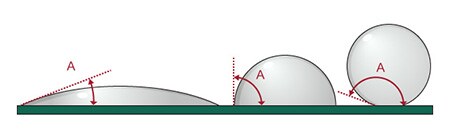 La bagnabilità della saldatura è indicata da un angolo di contatto θ tra una superficie solida e un liquido (ad esempio, la saldatura fusa) applicato a tale superficie. Quanto più piccolo è l'angolo A (angolo di contatto θ) nell'immagine, tanto maggiore è la bagnabilità della saldatura, indicando una situazione in cui il liquido è ampiamente applicato alla superficie solida. Maggiore è l'angolo di contatto, minore è la bagnabilità della saldatura, il che indica una situazione in cui la superficie solida respinge il liquido applicato.