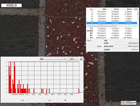 Il microscopio digitale 4K della Serie VHX consente la misurazione e il conteggio automatico di aree ad alta precisione con un'immagine ingrandita ad alta risoluzione. Queste funzioni consentono agli operatori di eseguire analisi quantitative e generare report con un'unica unità, migliorando significativamente l'efficienza.
