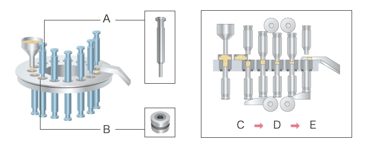 Le comprimitrici sono i dispositivi utilizzati nel processo di produzione delle compresse. Dotate di stampi, sono un tipo di pressa e vengono anche chiamate macchine a stampaggio rotativo. L'ingrediente in polvere aggiunto viene pesato automaticamente e inserito nel foro della matrice, lo stampo fisso. Dopodiché, lo stampo noto come punzone esercita una pressione sulla polvere dall'alto e dal basso, modellandola in una compressa. Nella produzione di massa di compresse, il riempimento con materiale in polvere, la compressione con lo stampo e lo scarico della compressa avvengono in modo continuo.